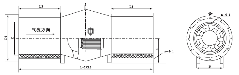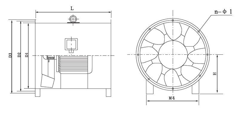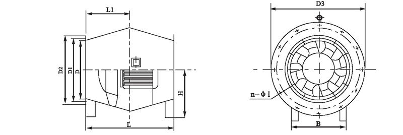 2.風機出廠時法蘭一般不打孔n-φ1僅供參考,若要打孔請用戶在訂貨時說明。